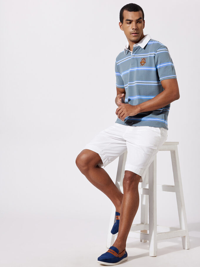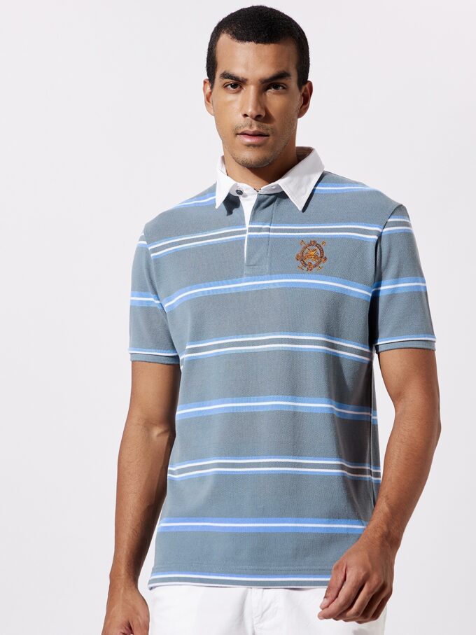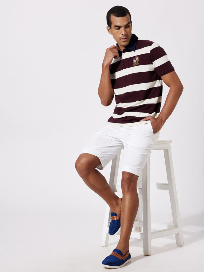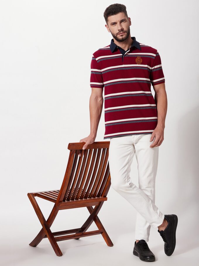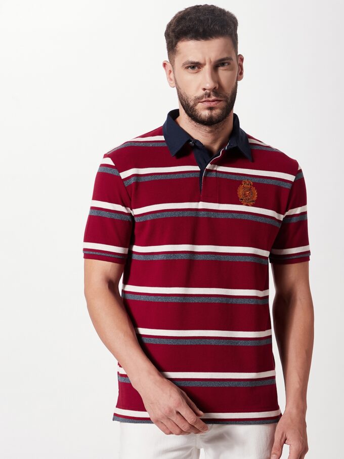 Fahrenheit men’s chest stripe rugby polo, a style that adds a sporty element to any look. It’s designed with soft fabric accented with colorful stripes and a classic buttoned placket.