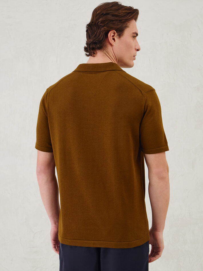 Crafted from cotton, this polo features a distinctive Johnny collar—an open V-neck design that offers a relaxed yet refined look. Its flat-knit construction ensures a smooth, breathable texture, making it suitable for both casual outings and semi-formal occasions.