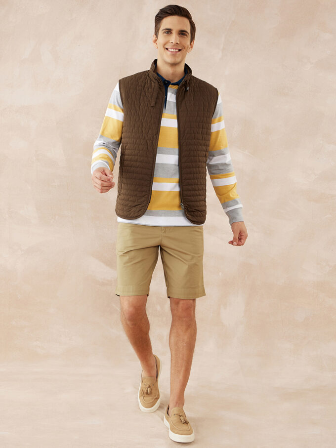 This quilted jacket and its lining are made with polyester, which maintains its loft and warmth without the bulk of down. Featuring left chest buttoned pocket, two side pockets with zip closure, double vent with snapped closures, snapped storm placket and ventilating metal grommets at the underarms.