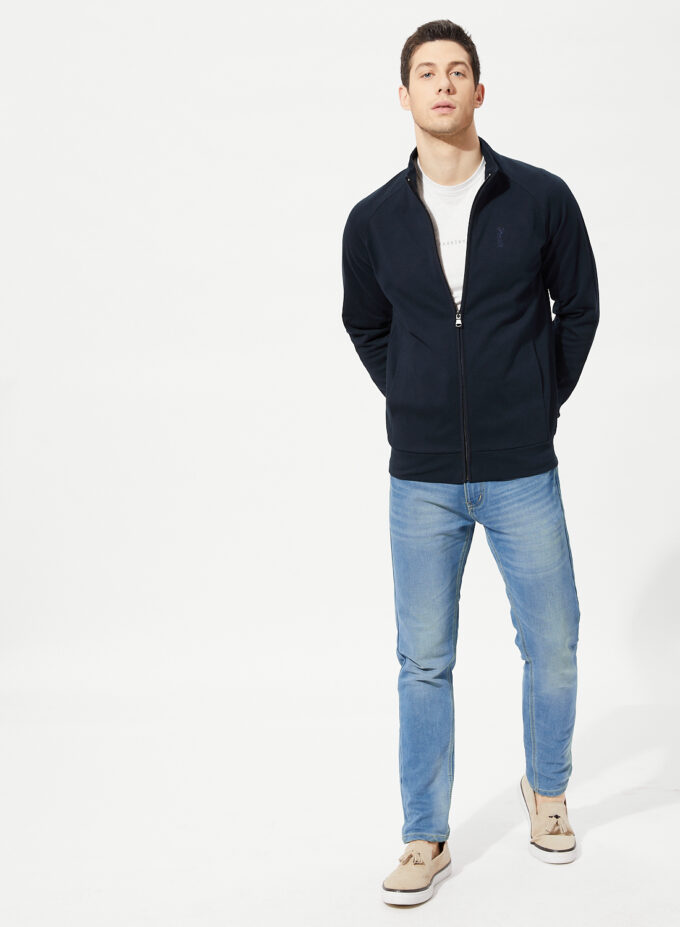 Solid zip sweatshirt by Fahrenheit is an ideal for a chilly winter day. Designed with a soft warm fleece for ultimate comfort and breathable outer layer. Golfer logo on the chest gives it a sporty look.