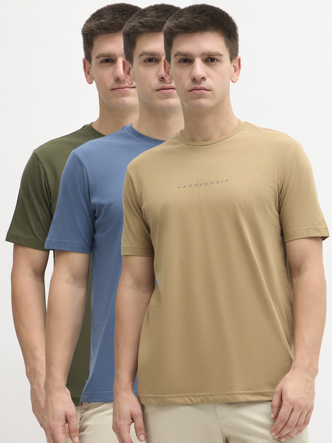 Pack of three round neck T-shirts with short sleeves and Fahrenheit branding on the chest.