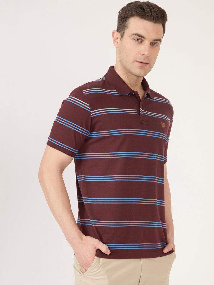Get your hands on this jersey polo, featuring horizontal stripes all over. Additionally, it has soft polycotton fabric to provide all-day wearing comfort. The perfect bridge between casual and formal dressing.