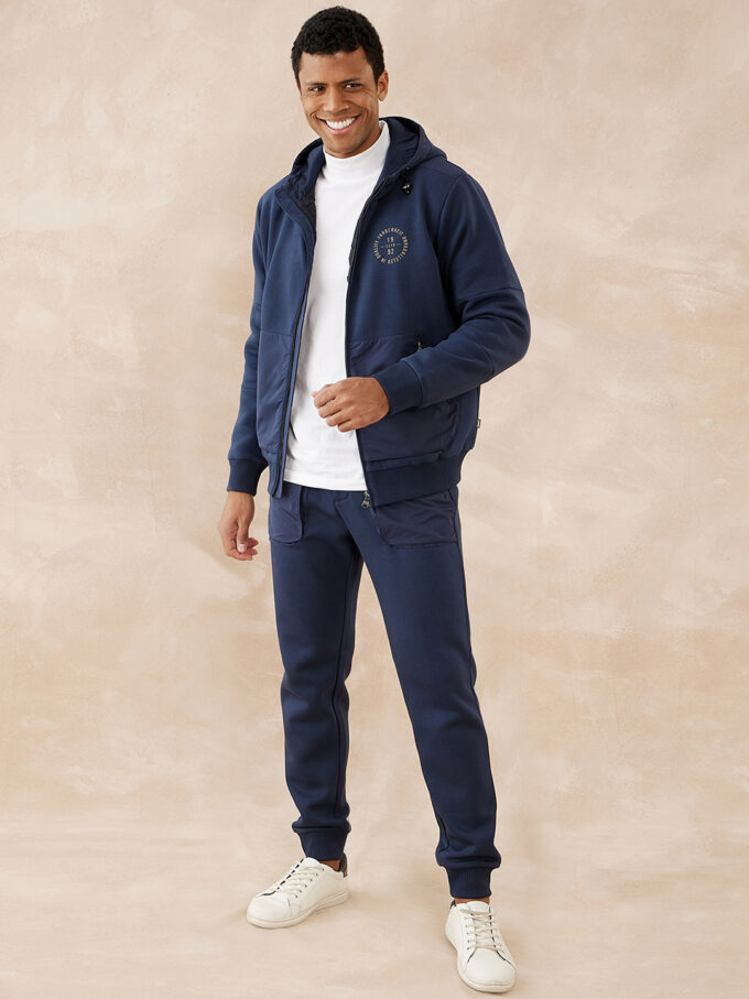 Comfortable bottom in cotton blend fabric and relaxed-fit silhouette with exterior drawcords, with open-hem, exterior drawcords, side pockets and one back pocket for extra storage.