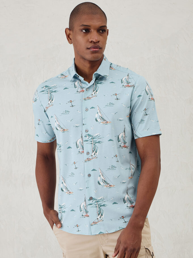Our Palm & Sail Paradise Shirt, the epitome of coastal elegance and tropical allure. Crafted with meticulous attention to detail and a passion for seaside charm, this shirt is your passport to laid-back luxury and effortless style.