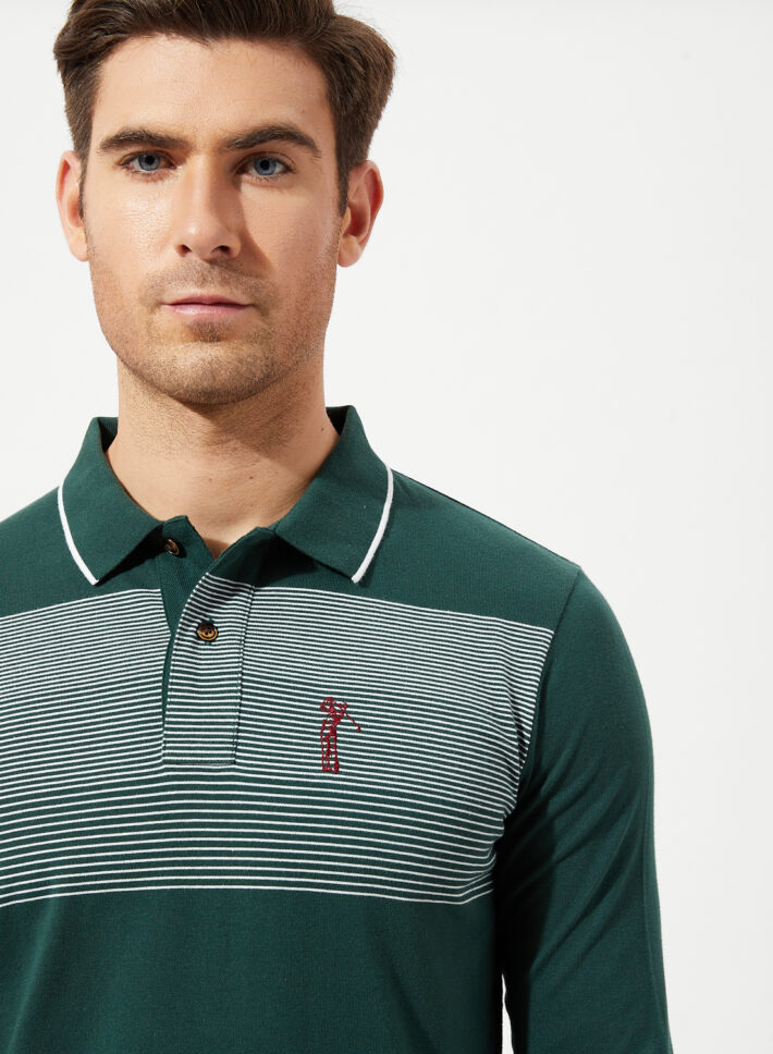 Fahrenheit men’s polo crafted from cotton jersey that’s breathable and comfortable. Refresh your smart-casual wardrobe with this striped polo shirt. Golfer logo embroidered on the chest.