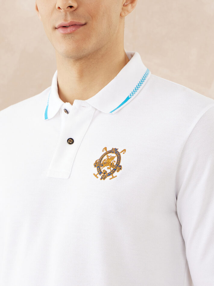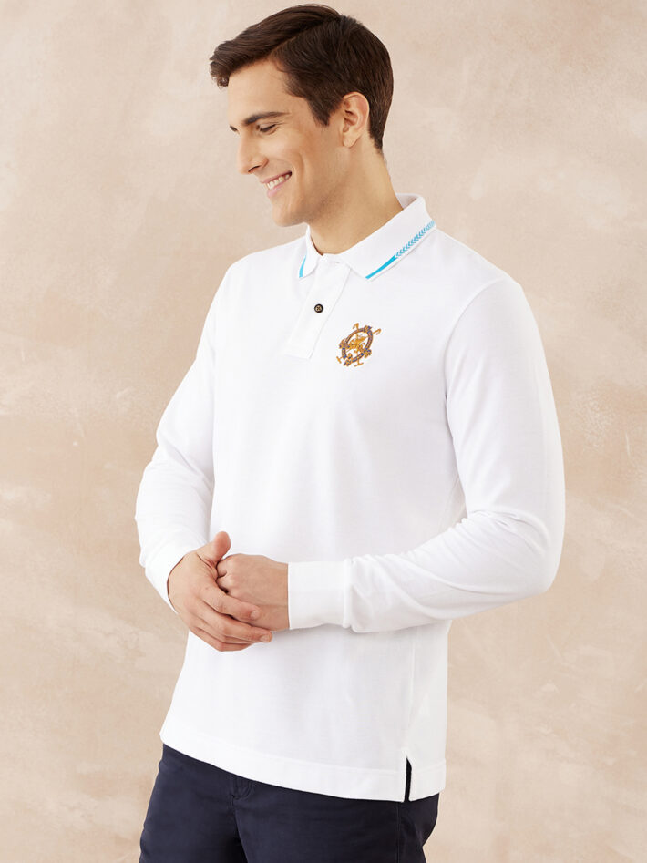 A simple and versatile polo for an all-day stylish and comfortable look. This long sleeve polo comes in a clean, classic silhouette with a tipped collar and logo on the left-side chest.
