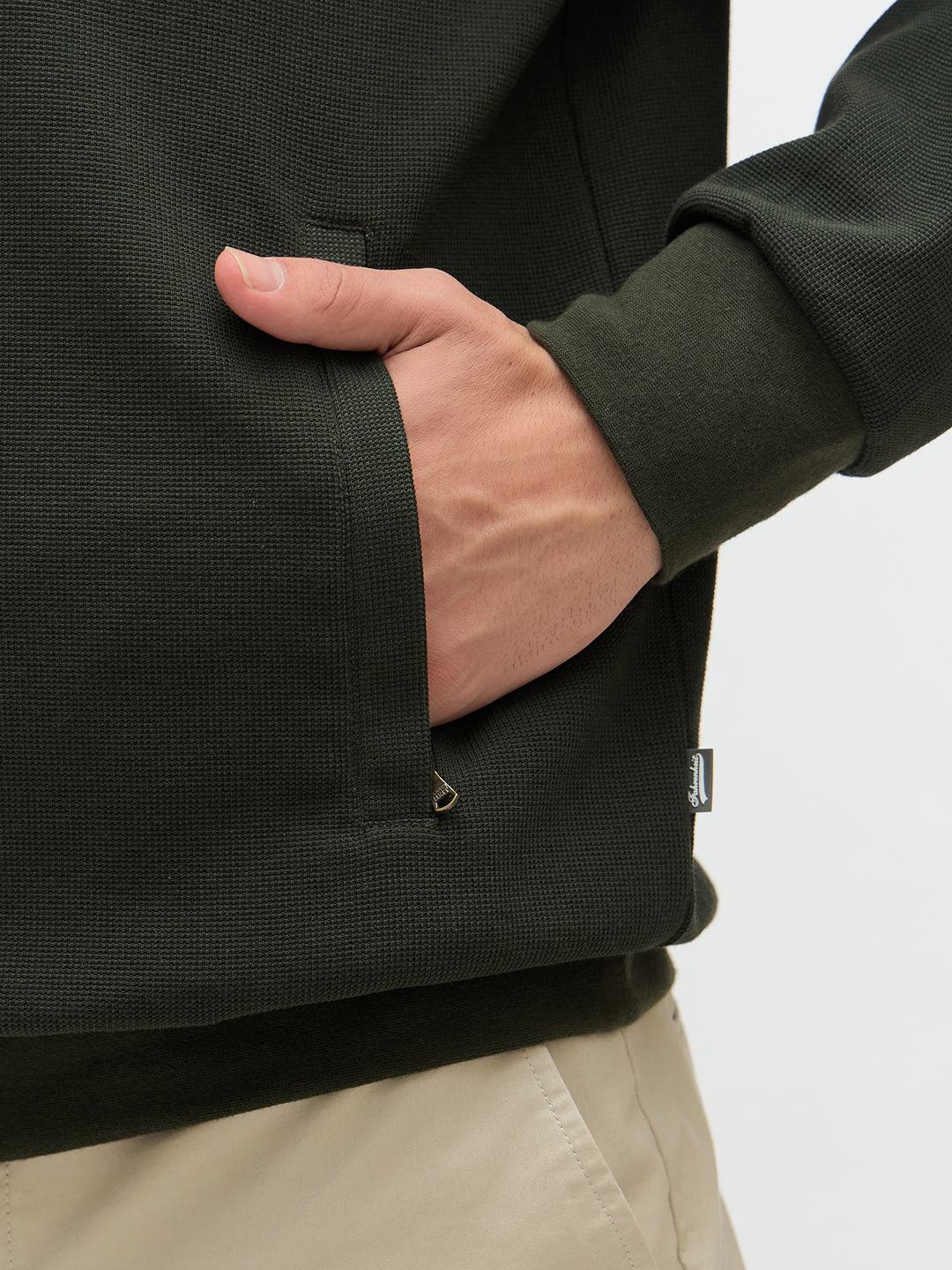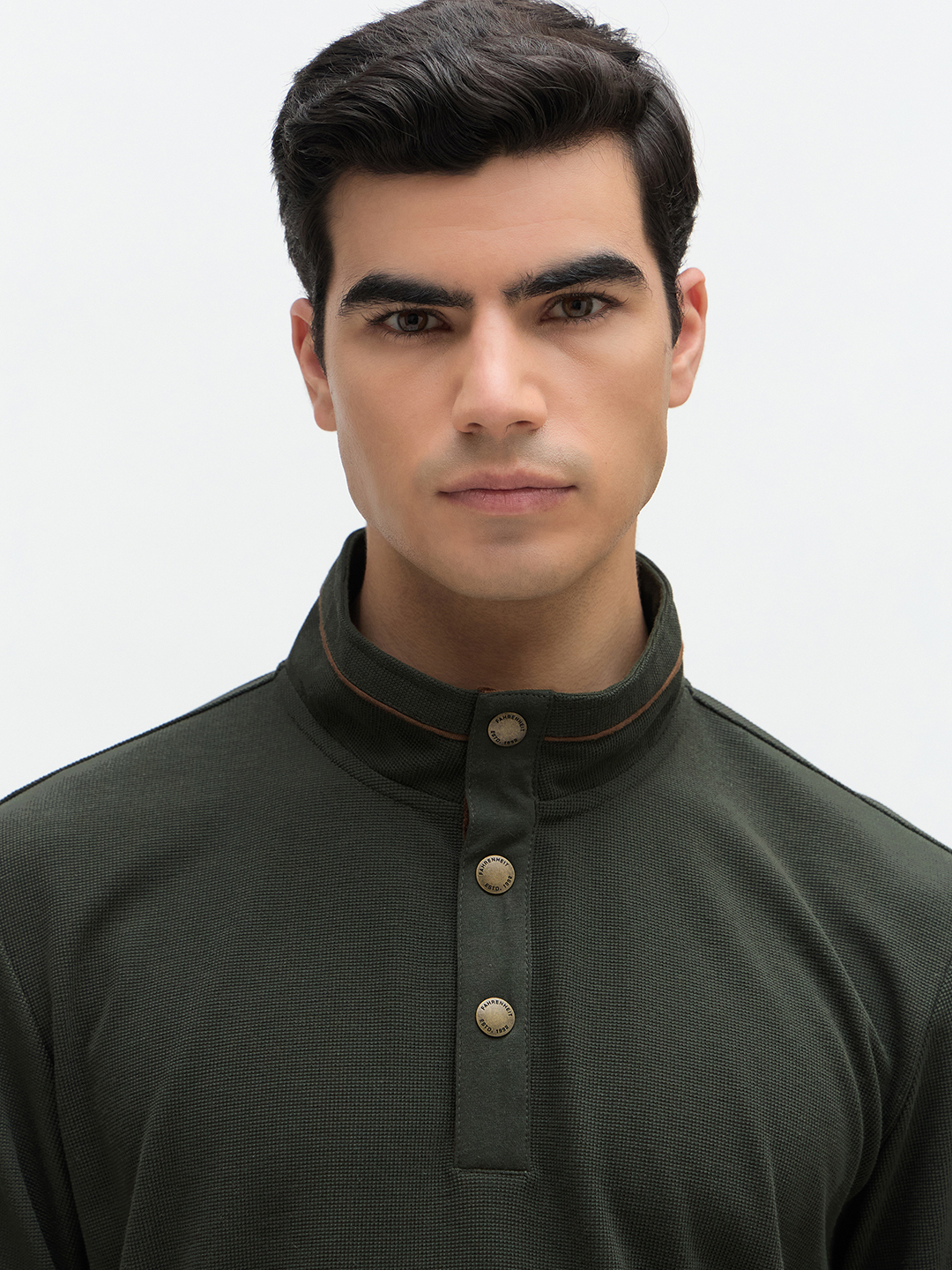 he Waffle Knit Sweatshirt with Placket is a stylish and cozy addition to your wardrobe, perfect for layering or wearing solo. This sweatshirt features a unique waffle knit texture that adds visual interest and warmth without bulk.